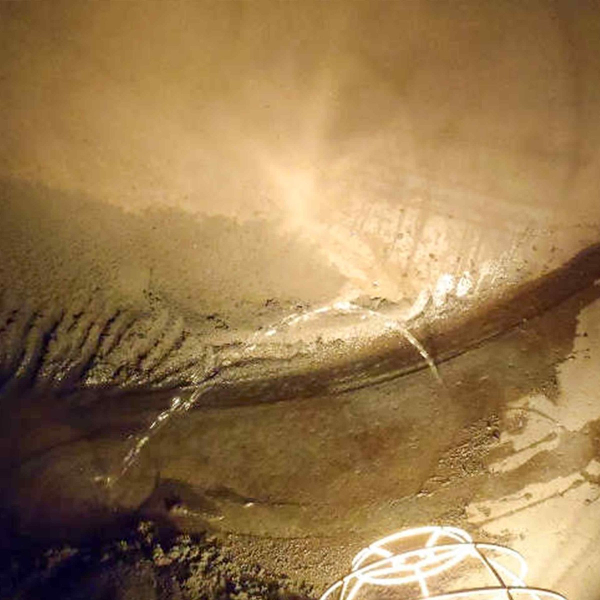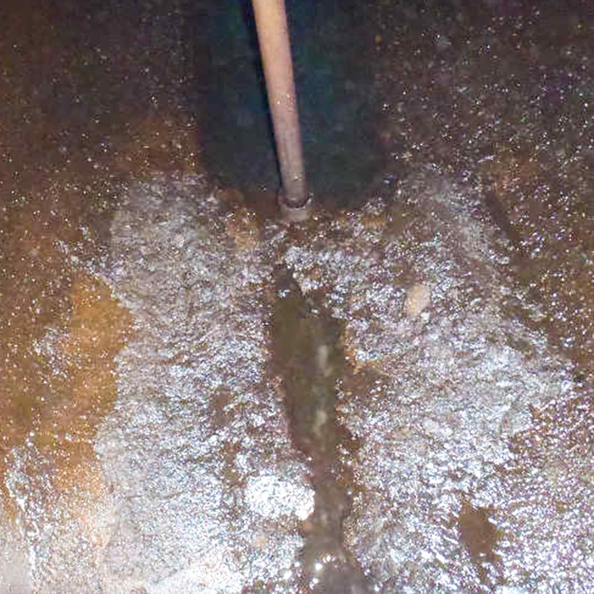 この写真はライニングを目的としたタンク内サンドブラスト(一種ケレン)を施工中にタンクの外側から孔食が進んで穴が開いて地下水が噴き出してきた状態のタンクです。