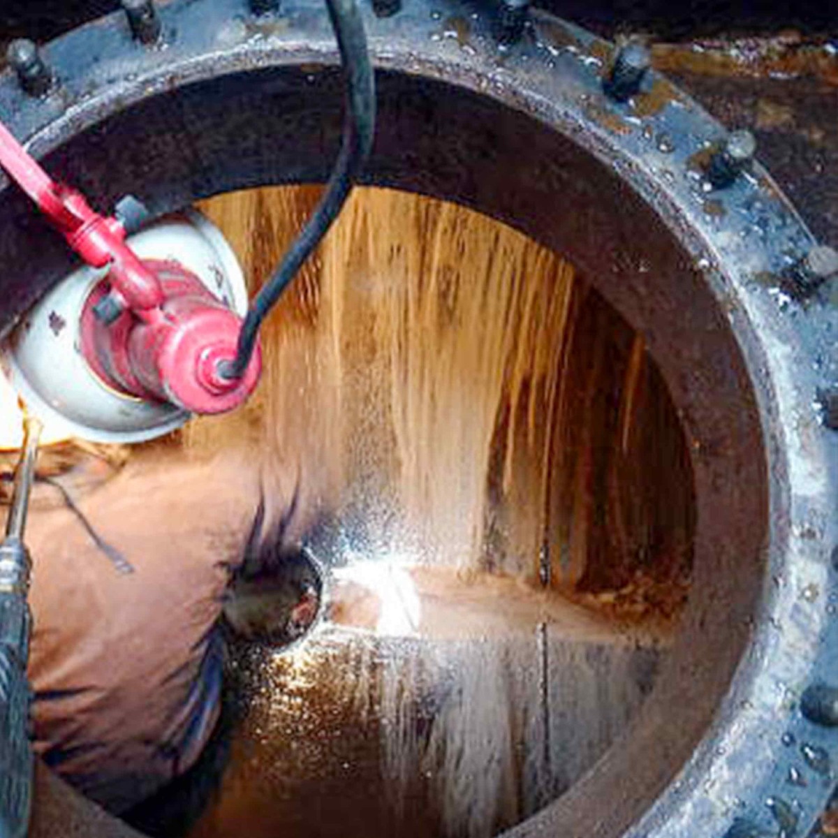タンクに水が入ると言うことで圧力検査をしてプクプク泡が出るので、内部を高圧洗浄してくれと依頼された現場です。
